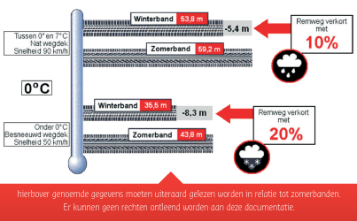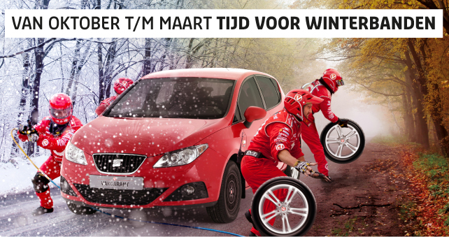 November tot en met maart; Kies voor winterbanden! Hoe hoog de kwaliteit van uw zomerbanden ook is, bij temperaturen onder de 7°C hebben ze minder grip en een langere remweg dan winterbanden. Door de speciale rubbersamenstelling en profielopbouw blijven winterbanden langer elastisch en flexibel. Daardoor bieden ze een betere grip op droge, natte, bevroren en besneeuwde wegen. Ook het risico op aquaplaning vermindert. Door de verbeterde grip is de remweg korter en heeft de auto een betere wegligging.
